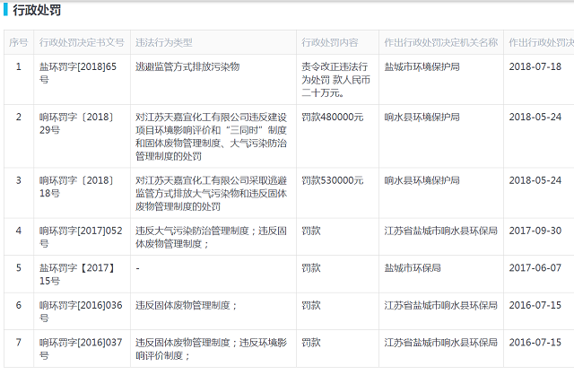 涉事企業(yè)天嘉宜化工成立于2007年,屬于化學原料和化學制品制造業(yè),多年存在環(huán)保、安全隱患。其中2016年7月~2018年7月,兩年左右時間,被環(huán)保部門處罰7次,處罰原因為違反大氣污染管理制度、違反固態(tài)廢物管理、 違反環(huán)境影響評價制度。