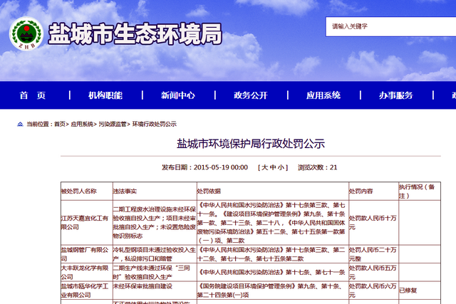 鹽城市環(huán)境保護局2015年5月19日公布的行政處罰公示顯示,江蘇天嘉宜化工有限公司二期工程廢水治理設施未經(jīng)環(huán)保驗收擅自投入生產(chǎn);未設置危險廢物識別標志,處罰款人民幣10萬元。